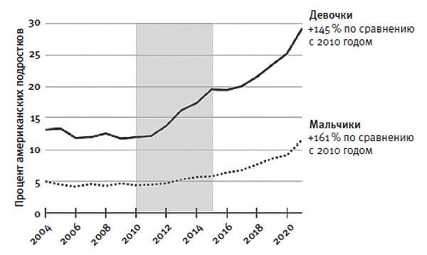 Сам я не склонен к тревожности и депрессии, но страдал от продолжительной тревоги, требующей приема лекарств, в течение трех периодов жизни. Один из них сопровождался диагнозом тяжелой депрессии. Поэтому я могу в некоторой степени посочувствовать тому, что переживают многие молодые люди. Я понимаю, что подростки с тревожными или депрессивными расстройствами не могут просто «взять себя в руки» или «перестать ныть». Эти расстройства вызваны комбинацией генов (некоторые люди более предрасположены к ним), моделей мышления (которым можно научиться и от которых можно отвыкнуть), социальных и экологических условий. Но поскольку гены между 2010 и 2015 годами не менялись, нужно понять, какие сдвиги в моделях мышления и социально-экологических условиях вызвали эту волну тревоги и депрессии.