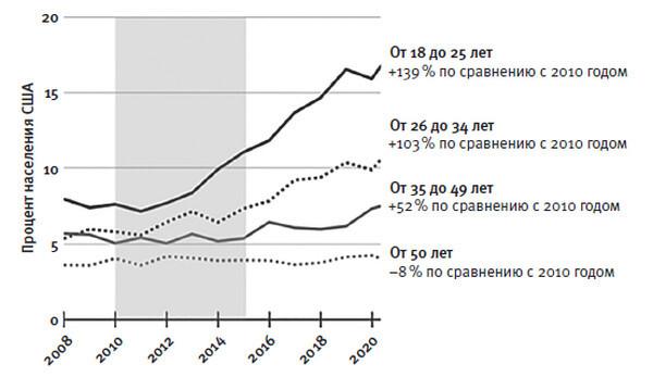 Вторая подсказка заключается в том, что всплеск сосредоточен в поколении Z, несколько захватывая самых молодых миллениалов. Это заметно на рисунке 1.3, где показан процент респондентов в четырех возрастных группах, сообщивших, что в прошлом месяце чувствовали тревогу «большую часть времени» или «все время». До 2012 года ни для одной из четырех групп не проявляется выраженной динамики, но затем самая молодая группа (в которую с 2014 года начинает входить поколение Z) резко уходит вверх. Следующая по старшинству группа (в основном миллениалы) тоже растет, хотя и не так сильно, а две самые старшие остаются относительно неизменны: наблюдаются небольшой рост для поколения X (родившихся в 1965–1980 годах) и небольшое снижение для беби-бумеров (родившихся в 1946–1964 годах).
