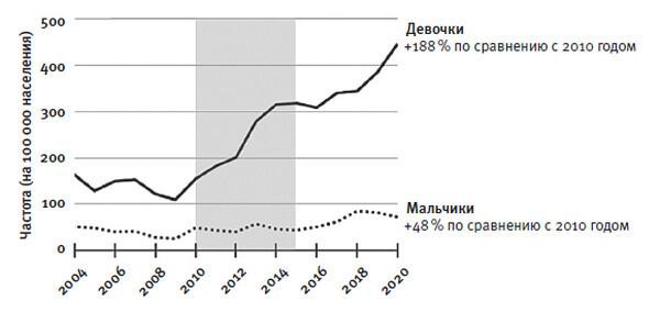 Рис. 1.9. Случаи самоповреждения среди британских подростков. Случаи самоповреждения среди подростков Великобритании (13–16 лет). (Источник: Cybulski et al., 2021, на основе двух баз данных анонимных британских медицинских записей.)[84]
