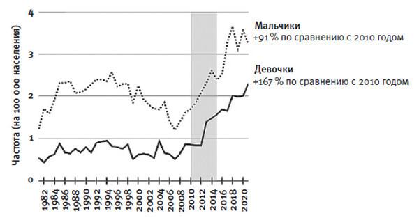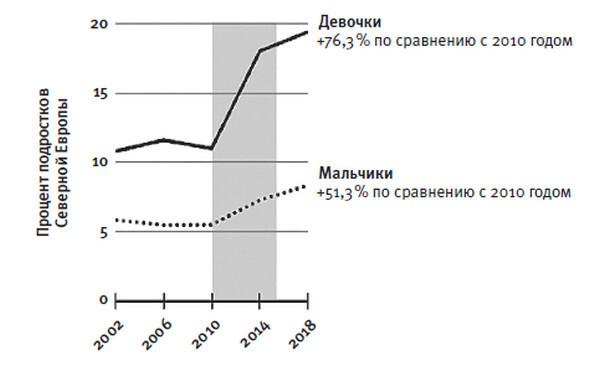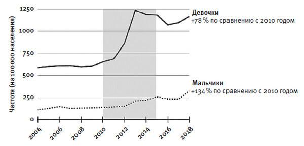 Как и в Соединенных Штатах, изменения в поведении подростков соответствуют изменениям в их оценке собственного психического здоровья. Если мы посмотрим на частоту посещений канадскими подростками отделений неотложной психиатрической помощи из-за самоповреждений, то обнаружим почти ту же картину, что и на рисунке 1.4 для американских детей[85].