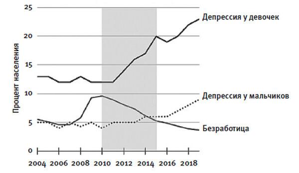 Невозможно связать всплеск подростковой тревожности и депрессии с конкретными экономическими событиями или тенденциями. Более того, непонятно, почему экономический кризис навредил бы девочкам – особенно самым юным подросткам – больше, чем мальчикам.