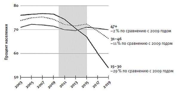 На рисунке 1.8 показан процент канадских девушек и женщин, которые оценили свое психическое здоровье как «отличное» или «очень хорошее». Если бы сбор данных прекратили в 2009 году, можно было бы сделать вывод, что самая молодая группа (15–30 лет) одновременно самая счастливая и поводов беспокоиться нет. Однако в 2011 году их показатели начали опускаться, а затем полностью рухнули, в то время как показатели самой старшей группы женщин (от 47 лет) остались практически неизменны. График для мальчиков и мужчин отражает ту же тенденцию, хотя и с меньшим снижением. (Этот и многие другие графики можно найти в онлайн-приложении к книге, где для каждой главы создан отдельный документ. См. anxietygeneration.com/supplement.)