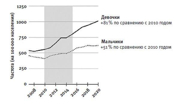 На рисунке 1.4 показано количество посещений пунктов неотложной помощи в Соединенных Штатах. Закономерность, которая прослеживается на графике, сходна с ростом показателей депрессии на рисунке 1.1 – особенно среди девочек.