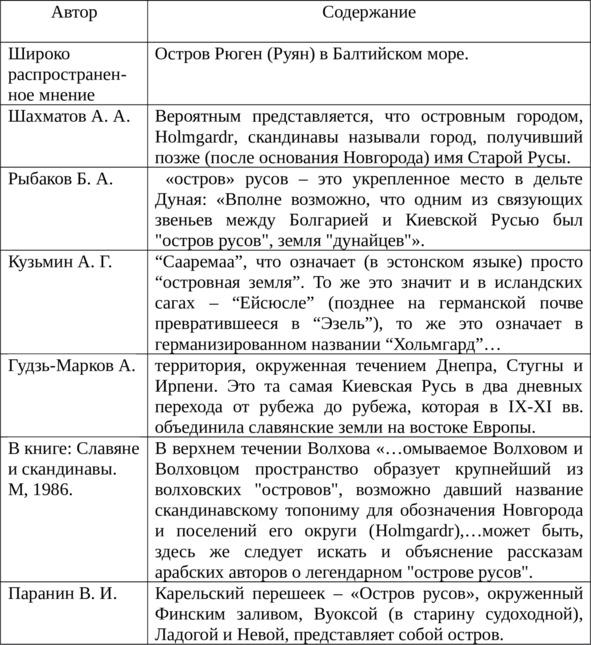 Рассказы об «Острове русов» появляются в арабской литературе в IX веке и вызывают до сих пор множество предположений и догадок о его местонахождении (локализации). Основные версии местонахождения «Острова русов» представлены в табл. 2.