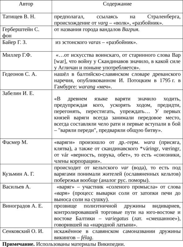 Но даже Словарь Фасмера не смог отразить все версии этимологии этнонима варяг. Мы попытались собрать существующие версии этимологии этнонима варяги (см. табл. 1), но, по всей видимости, с этой задачей также не справились.