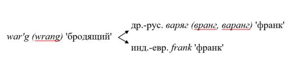 Постойте, так war’g (бродящий) — это же и есть варяг! В слове war’g r’ — это мягкое r [рь], поэтому оно читается как [варьг], а далее: варьаг (ср. варѩгъ) -> варяг. Да и топоры варяги тоже любили. Эта версия происхождения слова франк дает основание полагать, что древнерусское слово варяг, действительно, произошло не от слова франк, а они оба являются производными от war’g (wrang) (бродящий), а схема образования этнонимов франк и варяг будет выглядеть следующим образом: