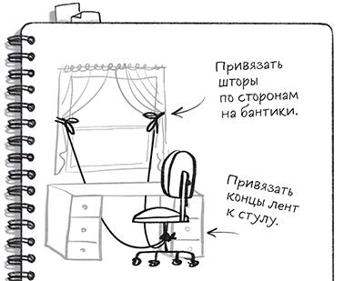 Сначала девочка подвинула свой стул вплотную к письменному столу. Затем влезла на подоконник, раздвинула шторы и подвязала их слева и справа от окна лентами. Длинные концы лент она пропустила между столом и подоконником и внизу привязала к ножке стула. Аппарат для опускания штор был готов! Теперь, стоило ей отодвинуть стул от стола, ленты натягивались, узлы на шторах распускались, и они закрывали собой окно.