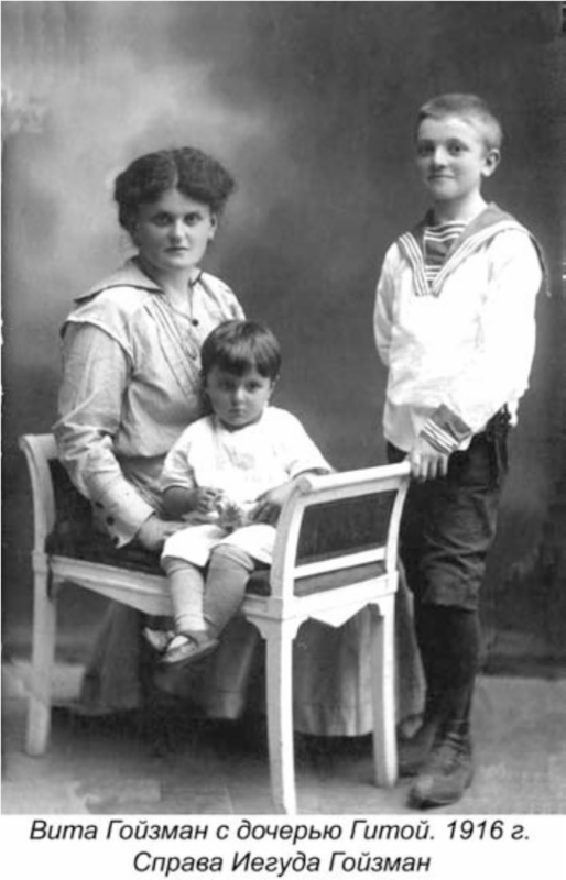 Мой отец, Рувим, в семье деда был четвертым. Он родился в 1909 году. Но из-за тяжелых родов моя бабушка умерла, и дед Иосиф-Вольф вскоре женился вторично. По старинному обычаю и по предсмертному пожеланию Шейны его женой стала незамужняя младшая родная сестра покойной. Звали ее Витой, и был ей в ту пору всего 21 год. Конечно, это был брак без любви, брак, навязанный традициями и приказом отца, который нарушить она не посмела. И свалились на молоденькую Виту нежданно-негаданно четверо детей старшей сестры. Но стать им второй матерью она так и не сумела. Иегуда, старший сын Шейны, из-за небольшой разницы в годах с мачехой до конца жизни звал ее по имени. Впоследствии родила Вита деду Иосифу еще одного сына и дочь — Мейера и Гиту.