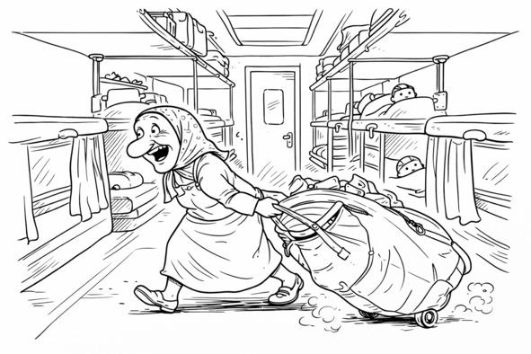 Девушка показала указательным пальцем вверх. Мужик поднял голову и присвистнул. На третьей полке, согнувшись в три погибели, сидела бабка Фима в полном обмундировании: верхней одежде, кедах на босу ногу, со школьным рюкзаком за спиной и в обнимку со своим огромным баулом. Как она удерживала такой огромный багаж — непонятно. Того и гляди баул выскользнет из ее тощих рук и свалится на голову кому-нибудь из пассажиров. Еще более интересный вопрос: как она подняла такую тяжесть на третью полку? А самое непонятное: зачем?