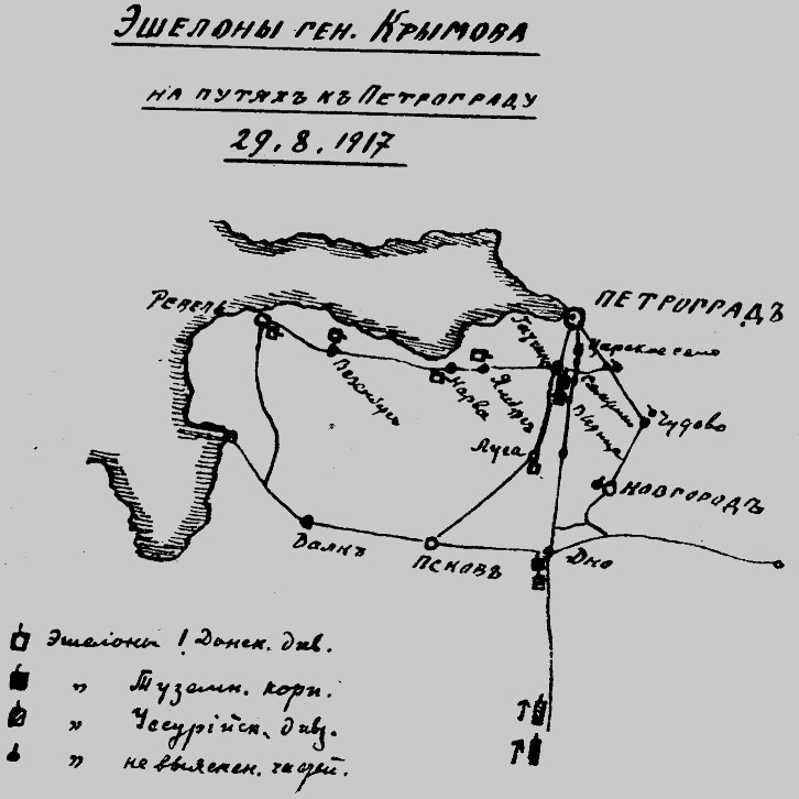 Еще 30 июля на совещании с участием министров путей сообщения и продовольствия Корнилов высказал взгляд: «для окончания войны миром, достойным великой, свободной России, нам необходимо иметь три армии: армию в окопах, непосредственно ведущую бой, армию в тылу — в мастерских и заводах, изготовляющую для армии фронта все ей необходимое, и армию железнодорожную, подвозящую это к фронту»… «Не касаясь вопроса — какие меры необходимы для оздоровления рабочей и железнодорожной армий, предоставляя разобраться в этом вопросе специалистам», Корнилов считал, однако, что «для правильной работы этих армий они должны быть подчинены той же железной дисциплине, которая устанавливается для армий фронта».[11]