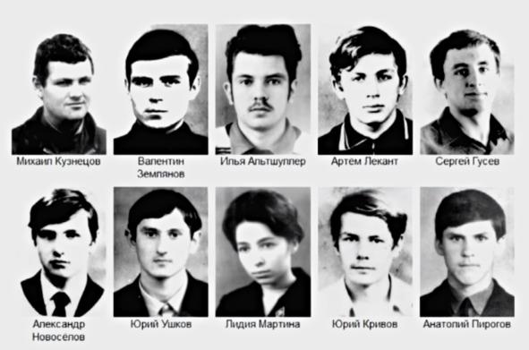 Согласно «официальной» версии в составе группы туристов Куйбышевского авиационного института (КуАИ) было 10 человек. Два руководителя: М. Кузнецов и В. Землянов. В группе было два выпускника КуАИ (Землянов, Альтшулер), студент юридического института (Кузнецов), инженер НИИ «Экран» (Мартина) и шесть студентов радиотехнического факультета КуАИ (Новоселов, Ушков, Лекант, Гусев, Кривов, Пирогов).