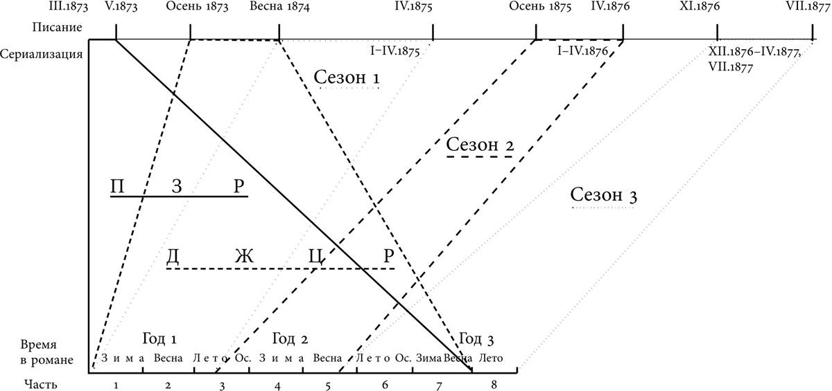 На верхней оси выделены пять стадий интенсивной работы Толстого над рукописными редакциями и/или журнальными выпусками романа — создание Первой законченной и Дожурнальной цельной редакций (ПЗР, ДЖЦР) и поэтапные переработка и завершение текста для печати. Под «сезоном» здесь имеется в виду период не только печатания определенной порции текста (сериализации), но и предшествующей подготовки. На нижней оси отображены структура АК (восемь частей) и внутренний календарь в их соотношении со стадиями работы над романом. Различие в пропорциях между отрезками вверху и их проекциями внизу передает изменчивую корреляцию между ходом работы и течением романного времени.