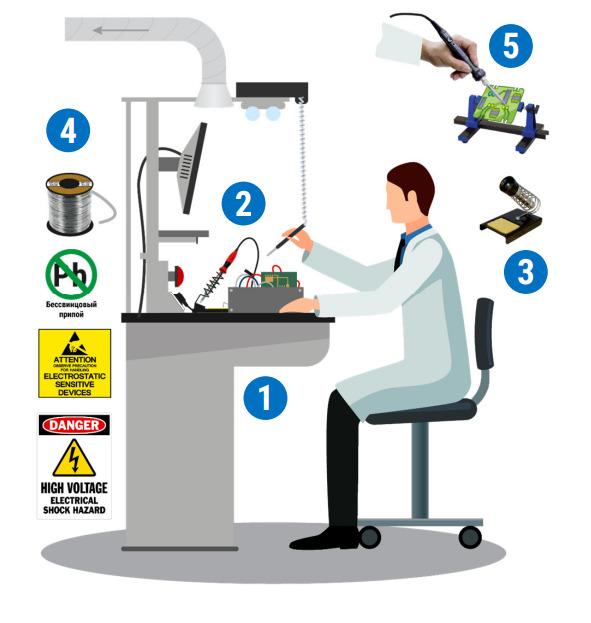 1. Стол. Размер рабочей поверхности стола должна быть такой, чтобы на ней свободно размещались компоненты БЛА, паяльник, монтажный инструмент и измерительные приборы. Крышка стола покрывается жаропрочным изоляционным материалом (гетинакс, текстолит или резина).
