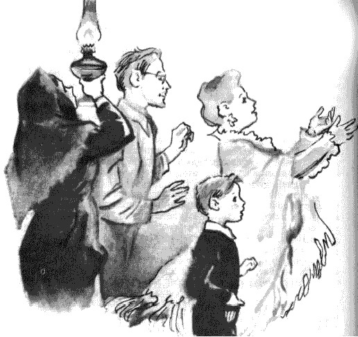 «…За ними, стуча морозными валенками, вошел ямщик, с ледяной бородой, с желтыми сосульками вместо усов, с белыми мохнатыми ресницами. На руках у него лежала девочка в белой, мехом наверх, козьей шубке. Склонив голову на плечо ямщика, она лежала с закрытыми глазами, личико у нее было нежное и лукавое».