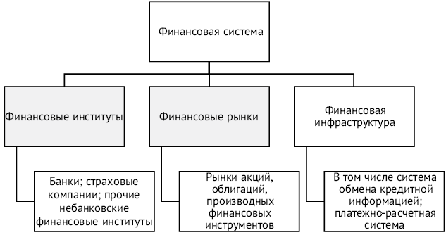 В иностранной литературе преобладает структурный подход, согласно которому финансовая система понимается в более узком смысле как «совокупность рынков и институтов, используемых для заключения финансовых сделок, обмена активами и рисками»61. В этом смысле финансовая система включает следующие основные элементы: