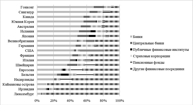 Рис. 2.3. Структура совокупных финансовых активов сектора финансовых корпораций в развитых странах, 2017, %81