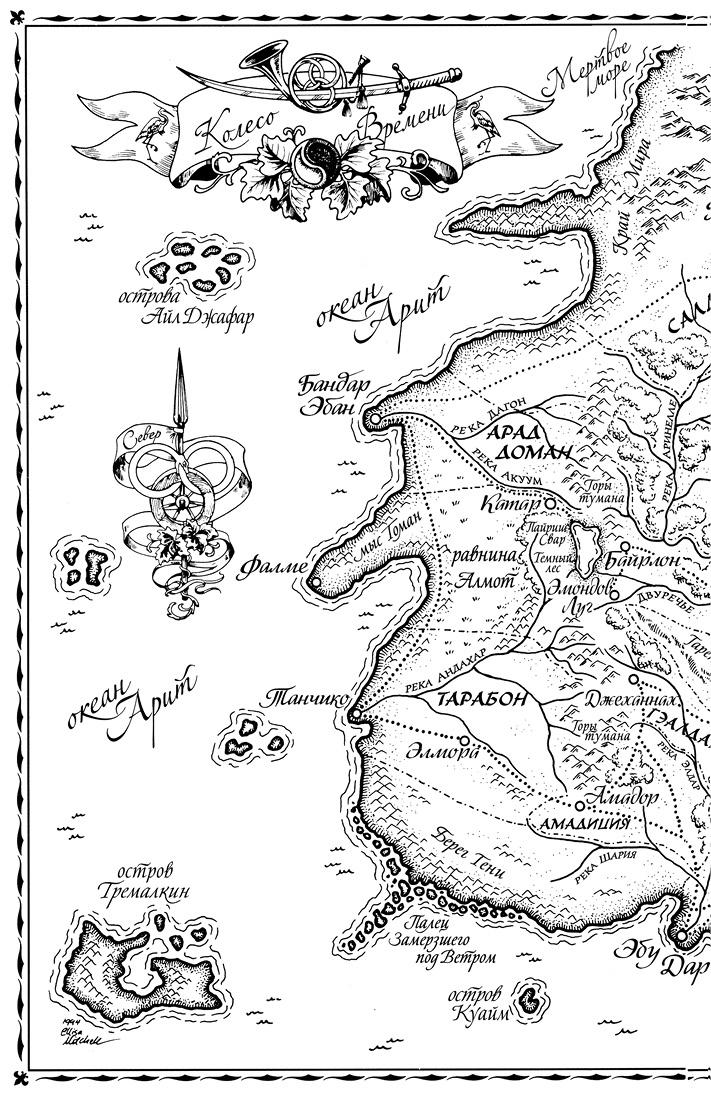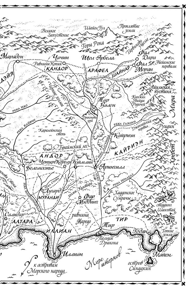 Элайда стояла у высокого окна с арочным сводом, расположенного на высоте около восьмидесяти спанов над землей, почти у самого верха Белой Башни. Отсюда открывалась вся даль за Тар Валоном — холмистые равнины и леса на берегу бегущей с северо-запада реки Эринин, с обеих сторон обтекающей остров и великий город на нем, обнесенный белыми стенами. Город уже наверняка испещрили длинные утренние тени, но с этой высоты все казалось ясным и светлым. Поистине, даже легендарные «поднебесные башни» Кайриэна не могли соперничать с Белой Башней. Конечно, башни Тар Валона ниже, и все же повсюду шла молва о них и вознесенных в небо подвесных мостах, что соединяли их между собой.