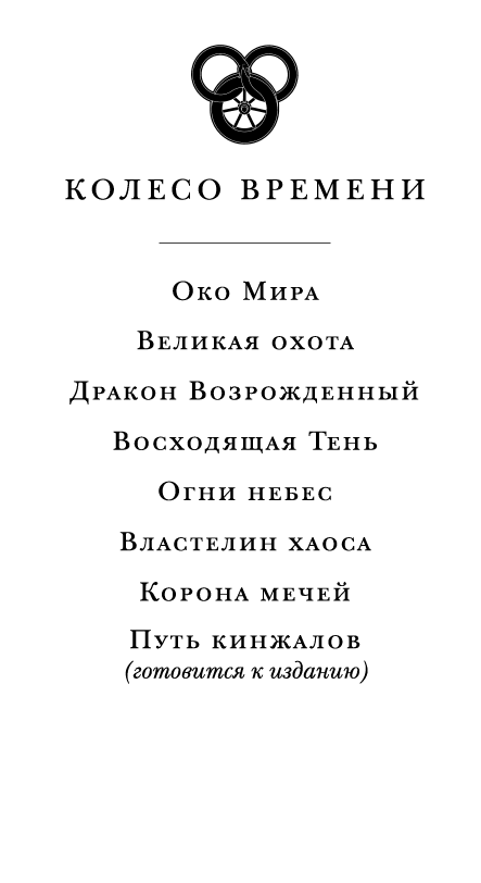 Она не так уж часто смеялась, но при виде часов, как обычно, не смогла удержаться от легкого довольного смешка. Семейле Сорентайн, одна из прежних Амерлин, вышедшая из Серой Айя, заказала эти часы, пытаясь хотя бы таким образом воплотить свою мечту о возврате к дням перед Троллоковыми войнами, когда ни один правитель не мог надеяться удержать трон без одобрения Башни. Однако грандиозные планы Семейле так и остались мечтами, канув в забвение, как и сама Семейле, и в течение трех столетий часы провалялись на пыльном складе, среди множества других давно позабытых вещей — ни одна Амерлин не осмеливалась выставлять их напоказ. Кроме Элайды. Колесо Времени не стояло на месте — оно поворачивалось, не останавливаясь ни на мгновение. То, что было когда-то, могло произойти снова. Должно произойти снова.