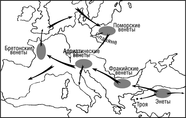 Катастрофа, постигшая Хеттскую империю, и разгром греками союзной хеттам Трои побудили энетов перебраться в Европу. Маршрут их переселения находим у Страбона (63 г. до н. э. – 24 г. н. э.): «Наиболее общепризнанным является мнение, что эти энеты были самым значительным пафлагонским племенем, из которого происходил Пилемен… Лишившись своего вождя, они после взятия Трои переправились во Фракию и во время своих скитаний пришли в современную Энетику (историческая область на Адриатике, в районе современной Венеции. – С. Ц.)». По археологическим данным, венеты появились на севере Адриатики около XII в. до н. э. Следует заметить, что Страбон знал и иные версии происхождения адриатических венетов, но предпочтение отдавал все-таки пафлагонской версии. Доказывая тождество адриатических венетов и пафлагонских венетов, он, в частности, обращал внимание на то, что те и другие разводили лошадей – занятие в тогдашней Европе отнюдь не повсеместное и не рядовое. По сообщению Страбона, «венетский способ разведения и дрессировки жеребят прославился у греков, и порода эта долгое время высоко ценилась». Впрочем, во времена Страбона венеты уже не занимались разведением коней, но в жертву богу Диомеду по-прежнему приносился белый конь[9].