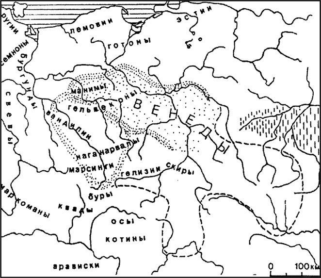 По сведениям Тацита, венеды занимали земли между свевами (германцами) на западе, певкинами на юге (в низовьях Дуная), сарматами на юго-востоке и финнами на северо-востоке.