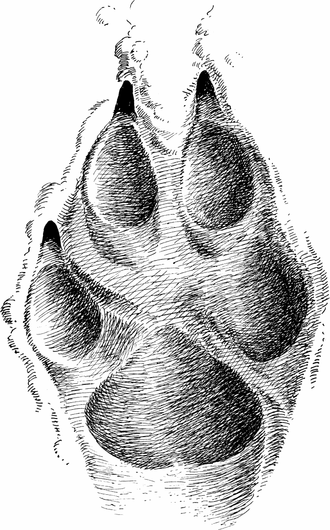 Рис. 4. Отпечаток правой передней лапы среднерусской лисицы на рыхлом мелком снегу. Подошвы ног к зиме густо зарастают шерстью – след получается широкий и расплывчатый (е. в.) Окр. Москвы. Февраль 1945 г. (сравни с рис. 5. и 288).