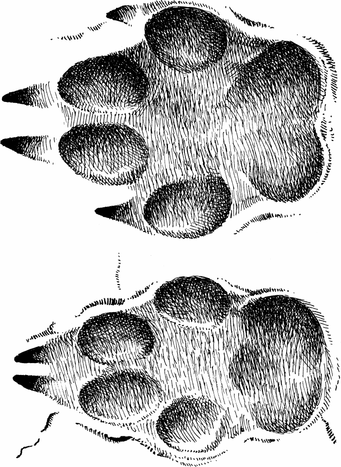 Следопыт не может рассчитывать, что ему в зимнее время всегда будут встречаться только такие четкие отпечатки лап, какие нарисованы в нашей книжке. Гораздо чаще ему придется пользоваться значительно худшими отпечатками, чтобы определить неясные следы, нужно знать их более постоянные, очень важные признаки.
