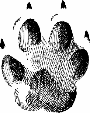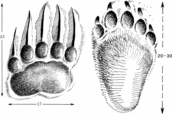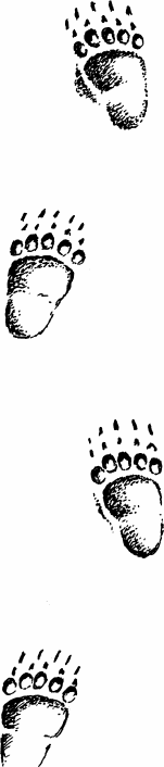 Рис. 14. След медведя на медленном ходу; задние лапы ступают на следы передних и почти полностью покрывают их.