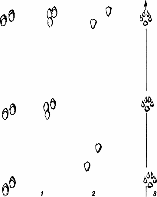 Рис. 1. Разные формы групп отпечатков: 1 – расположение отпечатков тесными парами или тройками – характерно для зверьков из семейства куньих (ласок, горностаев, хорьков, норок, куниц) и реже других видов. На прыжках задние ноги попадают точно в следы передних или слегка заходят за них; левые и правые отпечатки расположены близко к средней линии следа; 2 – следы прыжков тушканчика (скачет на задних ногах), отпечатки расположены парами, но отстоят далеко от средней линии следа; 3 – расположение отпечатков «цепочкой» или «веревочкой» характерно для следов лисицы, волка, корсака при обычной для них побежке – рысцой, а также для некоторых диких кошек, задние ноги попадают точно в следы передних.