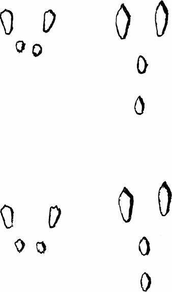 Рис. 9. Отпечатки задней и передней лап небольшой енотовидной собаки (е. в.). Пальцы раздвинуты веером, а не сжаты в комок, как у лисицы. Дельта реки Волги, октябрь 1951 г.