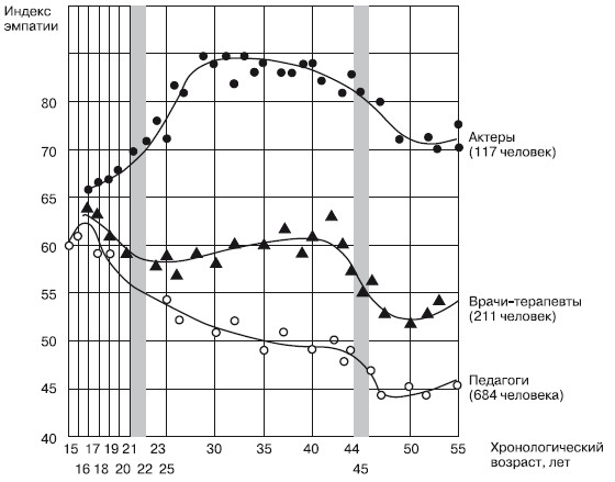 Роль естественного отбора (или, скорее, подбора) с учетом типологических особенностей свойств нервной системы заметна и в данных, полученных Л. А. Лепиховой и Т. Ф. Цыгульской (1982). Ими выявлено, что у 48 % учителей слабая нервная система и лишь у 8 % – сильная. У студентов музыкально-педагогического факультета педагогического института «крен» в сторону слабости нервной системы выражен еще больше (84,4 %). Зато у курсантов морского училища лиц со слабой нервной системой оказалось только 24 %. Остальные имели сильную и среднюю по силе нервную систему.