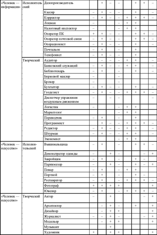 Все эти описания ПВК весьма приблизительны и во многом не отражают специфику ряда видов деятельности (Р. Д. Каверина (1981) насчитала 215 профессий, относящихся к типу «человек – человек»). Так, в разряд профессий типа «человек – художественный образ» в основном попали рабочие, а не творческие профессии: маляр-альфрейщик, ретушер, лепщик, печатник плоской печати, резчик, красильщик ткани, закройщик, модельщик и парикмахер. Спецификой этих профессий является в основном репродуцирование художественного образа, а не его создание, поэтому для них важны и такие ПВК, которые относятся к профессиям типа «человек – техника». В то же время не нашли отражения качества, необходимые в хореографии, актерском искусстве и других профессиях.