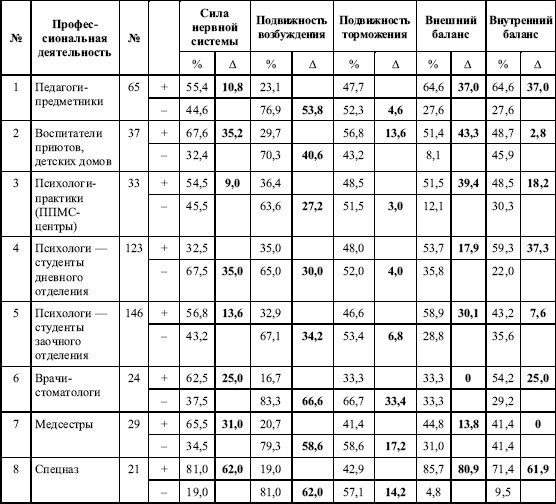 Из представленных в таблице данных видно, что спецназовцы сильно выделяются среди представителей других профессий по количеству лиц с сильной нервной системой (81 %). Выделяются этой же особенностью работники стоматологических поликлиник (врачи, медсестры) и воспитатели приютов и детских домов, деятельность которых тоже нередко проходит в экстремальных ситуациях и требует, как говорят в народе, «крепких нервов». Спецназовцы отличаются также высоким процентом лиц с преобладанием возбуждения по «внешнему» и «внутреннему» балансу.