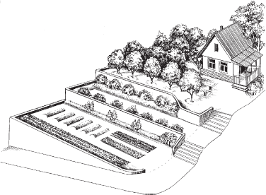 Размещение огородов на склонах. На склонах огородный участок размещают поперек (рис. 1). Это уменьшает эрозию и смыв верхнего слоя почвы. На склоне крутизной до 5° овощные культуры следует размещать в верхней части, а в нижней высаживать кустарники и деревья. При такой планировке кустарники и деревья хорошо защищают почву от размыва и сноса верхнего плодородного слоя. На склонах крутизной 5,1° и более площадь следует террасировать. Огороды размещают вдоль террас. Соотношение между шириной и длиной их должно составлять 1:4, 1:5. Террасы укрепляют деревьями и кустарниками и поддерживают в задерненном состоянии.