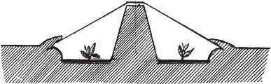 Бескаркасное укрытие (рис. 10) или холодный рассадник готовят с осени: хорошо удобряют землю под будущую рассаду и делают две грядки, между которыми насыпается невысокий (до 70 см) гребень, который станет естественным каркасом шатрового пленочного укрытия. Пленку, которой накрывают грядки, по краям удерживают земляные валы.
