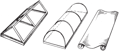 Пленочные укрытия (рис. 9) являются самыми простыми средствами защиты растений от резких колебаний температуры. В качестве каркаса для них могут служить железные прутья (толщиной 5–6 мм и длиной 1,6–1,8 м), лоза и ветки деревьев (ивы, тополя и т.п.), которые заглубляют в землю на 15–20 см. В сечении они могут быть полукруглыми (тоннельного типа) или треугольными (шатрового типа). Размеры конструкций незначительно колеблются, но наиболее приемлемыми можно считать высоту до 70 см, ширину до 150 см, а длину пролета – 1 м. После установки каркаса в нужное место его покрывают полиэтиленовой пленкой таким образом, чтобы можно было присыпать края землей. Некоторые овощеводы сверху пленки, для большей прочности, натягивают шпагат или тонкую бельевую резинку (тесьму).
