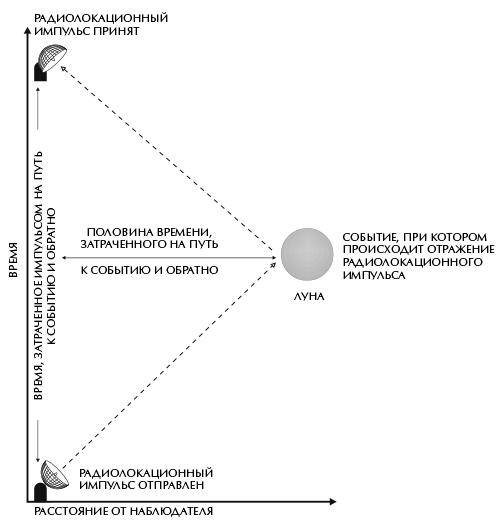 Каждый наблюдатель может использовать радар для определения места и времени того или иного события. Для этого наблюдатель отправляет радиоимпульс или импульс света и измеряет время приема частично отраженного импульса. Временем события считается середина интервала между отправлением исходного импульса и приемом отраженного импульса; расстояние до события определяется как половина времени, затраченного на ожидание приема отраженного импульса, умноженная на скорость света. (Под событием подразумевается нечто, произошедшее в некой точке пространства в некоторый момент времени.) Суть этого описания иллюстрирует рисунок 2.1, это пример пространственно-временной диаграммы. Прибегнув к помощи радара, движущиеся относительно друг друга наблюдатели приписывают одному и тому же событию разные время и положения. Измерения ни одного из наблюдателей нельзя считать более правильными, чем измерения какого бы то ни было другого наблюдателя, но все измерения взаимосвязаны. Любой наблюдатель может точно вычислить время и положение, которые припишет данному событию любой другой наблюдатель, при условии, что ему известна относительная скорость этого наблюдателя.