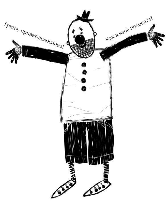 Но костики бегают побыстрее гринь, и поэтому им достаётся больше. Ему досталось больше розовой краски, а почти вся голубая отошла во владение Грини. И голубая и розовая летели во все стороны с большой скоростью, и через полчаса всё было готово. Гриня и Костик мало чем отличались от выкрашенной стены, чем были жутко довольны. В запасе у них была ещё красная, зелёная, сиреневая, оранжевая и ещё куча всяких разных других красок. Так что на наших замечательных измалёванных клоунов скоро стал похож весь маленький, но очень Нижний Клоунск. Всем это очень понравилось, и было решено перекрашивать стены домов хотя бы раз в месяц. Вот такая история про Костика и Гриню.