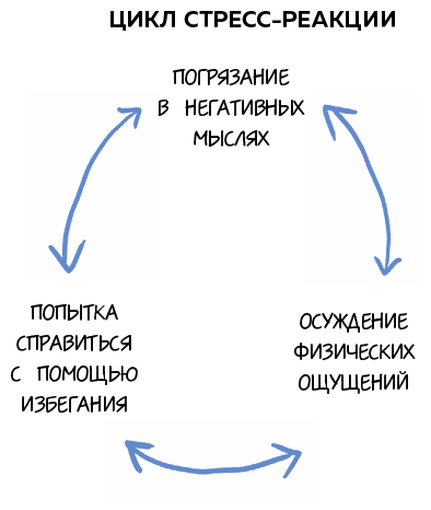 Однако сначала важно разобраться с основными привычками, которые, возможно, мешают вам справляться со стрессом. Большинство людей, которые борются со своей реакцией на стресс, 1) погрязают в негативных мыслях, 2) оценивают физические симптомы стресса и 3) стараются избегать всего, что вызывает у них стресс. Проблема в том, что каждый из этих трех компонентов способствует реакции организма на стресс, которая усиливается, усугубляя ситуацию. Например, если вы говорите себе: «Я не смогу!» – это может вызвать физические симптомы, будь то дрожь, сухость во рту или другие ощущения. Это приводит к другой распространенной реакции – критике естественной реакции организма на стресс, которая только усиливает катастрофические мысли. И поэтому мы сосредоточиваемся на том, чтобы избегать всего, что вызывает у нас стресс, вместо того чтобы двигаться к тому, что для нас важно. Вы понимаете, к чему я клоню: по мере того как цикл продолжается, становится все труднее найти перспективу и решить те проблемы, которые изначально заставили вас испытывать стресс.