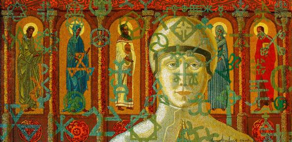 Особого внимания заслуживает древнерусский орнамент, который зародился в Древнерусском государстве и стал одним из видов декоративно-прикладного искусства. Его влияние распространилось на Польшу и даже Скандинавию.[7] Среди видов орнамента широкое распространение получил звериный и растительный орнамент, например «топорик Адрея Боголюбского» орнаментирован звериным стилем. Следует заметить, что древнерусские мотивы можно обнаружить во многих работах А. П. Акиндинова. В картине «Андроид и религия» на рисунке 2 отчётливо прослеживаются отголоски традиций древнерусской иконописи и узоры близкие по стилю к орнаментам Киевской Руси.