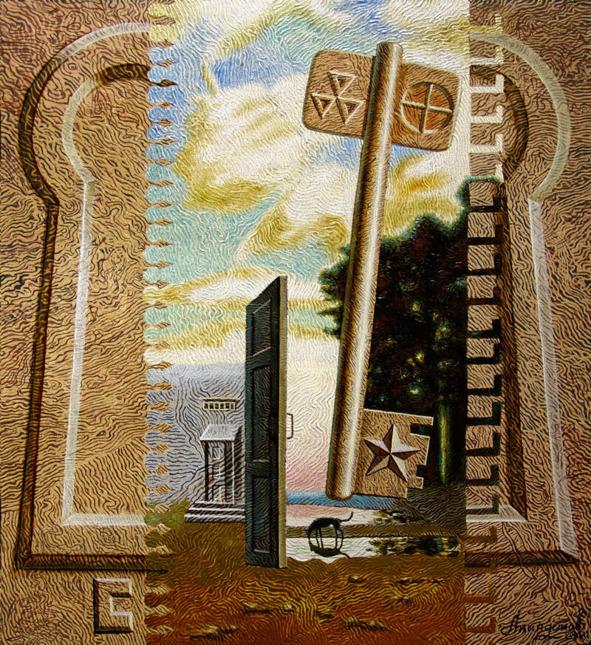 Картина А. П. Акиндинова «Открытие» (рис. 4) и «Ключи Марии» С. А. Есенина — оба произведения были созданы выходцами с Рязанской земли. Тема «Есенин» стала ключевой в искусстве художника и орнаментализм, как направление в искусстве черпает в «Ключах Марии» своё теоретическое и концептуальное обоснование. «Все, что рассматривается извне, никогда не рождается в ясли с лучами звезд в глазах и мистическим ореолом над головой. Звезды и круг — знаки той грамоты, которая ведет читающего ее в сад новой жизни и нового просветленного чувствования. Наши исследователи не заглянули в сердце нашего народного творчества».[13]