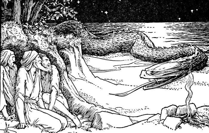 «Сложив узлы на прибрежном песке, – рассказывал Синдбад, – мы уселись и стали всматриваться в океан, не увидим ли корабль. Но в течение нескольких часов не показывалось ни одного. Наконец мне почудился странный, жужжащий или шипящий звук. Он становился все громче и громче: очевидно, приближался к нам. Вскоре мы заметили на горизонте черное пятно, которое росло, росло и скоро превратилось в чудовище, плывшее по морю, причем большая часть его туловища выдавалась над поверхностью воды. Оно приближалось к нам с изумительной быстротой, выбрасывая огромные клубы дыма и озаряя ту часть моря, по которой двигалось, длинной, далеко тянувшейся полосой света.