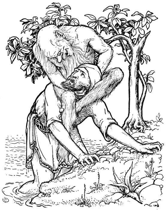…Я пустился опрометью на холмы, но был настигнут толпой этих человекообразных существ и перевезен на чудовище, которое сейчас же после этого поплыло в море.