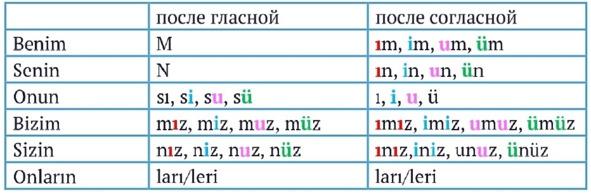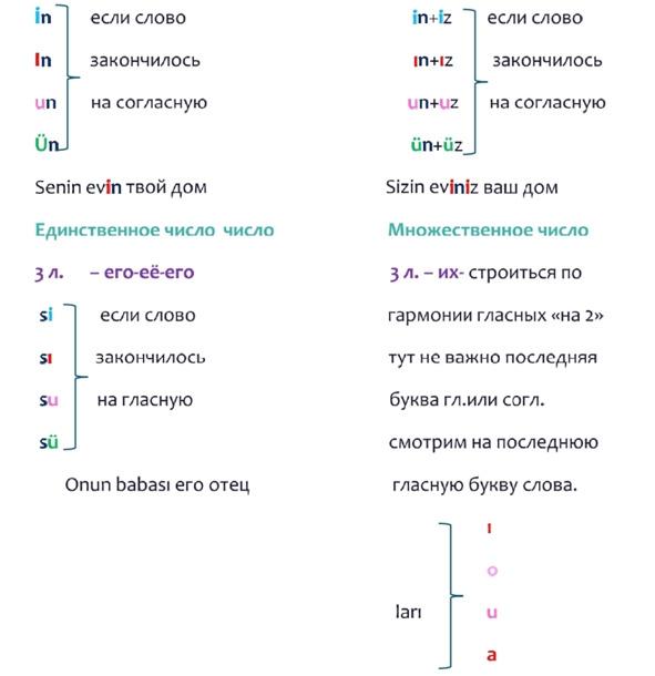 Сам принцип добавления притяжательных аффиксов к слову мы уже разобрали и выучили вариант для 1 л. ед. ч. Оставшиеся аффиксы для удобства собраны в схемы. Важным моментом является то, закончилось ли слово, к которому мы будем их присоединять на гласную или согласную буквы. Помните, чтобы выбрать верный вариант аффикса, мы смотрим на последний гласный в слове и подбираем аффикс под него. Всегда четко следите за этим. Обратите так же внимание, что лица в единственном и множественном числе как бы дублируют друг друга, получая лишь более длинный хвостик, это наблюдение поможет Вам их быстрее выучить.