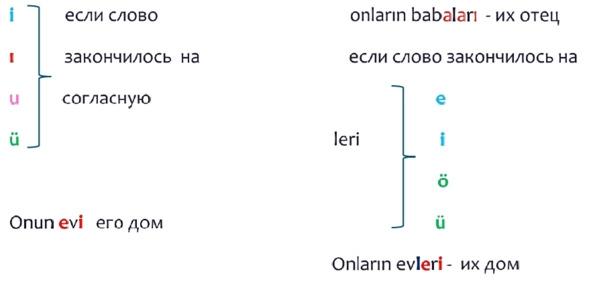 Гармония такого типа будет встречаться нам в самых разных правилах турецкого языка, но для знакомства возьмем правило образования множественного числа.