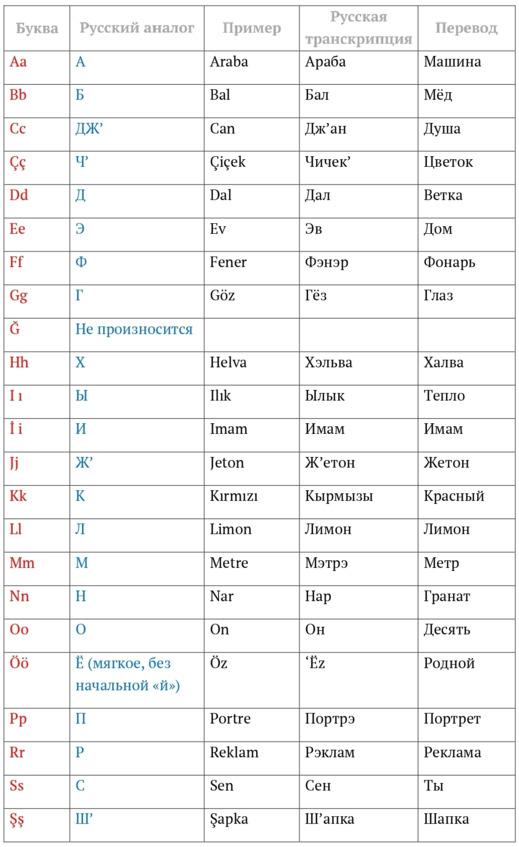 Как мы видим, турецкий алфавит взял за основу латинские буквы, поэтому все, кто изучал в школе английский, немецкий, французский или испанский очень быстро выучат буквы, тем более, что в турецком языке одна буква ровняется одному звуку. Никаких буквосочетаний нет. Практически, все как слышится, так и пишется.