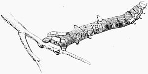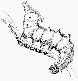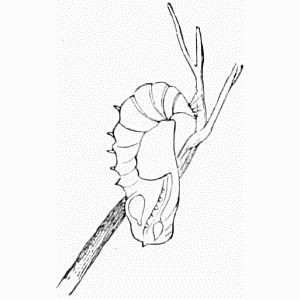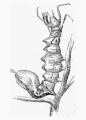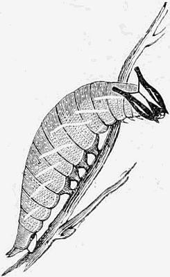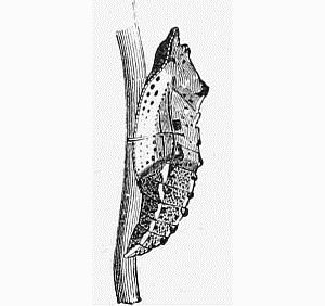 The eggs are laid on the twigs of these trees late in the summer, and the young caterpillars do not appear till the following spring. The chrysalis may be found attached to an elm twig or leaf about the end of June.
