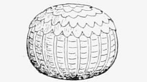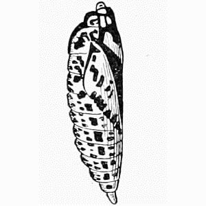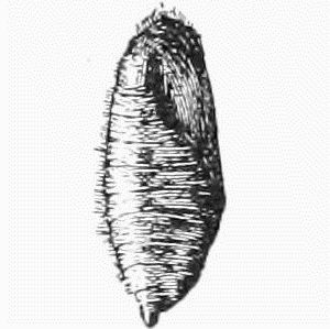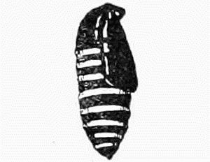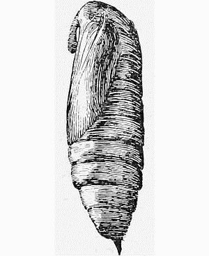 The chrysalis is short and rounded, of a dull green colour, tinged with brown on the under surface.