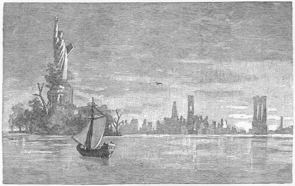 Right ahead, in the middle of the bay, towered a gigantic statue, many times higher than the masts of our ship. Beyond, from behind this statue, came the broad river upon whose waters we were floating, its surface all a-glitter with the rising sun. To the East, where Nōfūhl was pointing, his fingers trembling with excitement, lay the ruins of an endless city. It stretched far away into the land beyond, further even than our eyes could see. And in the smaller river on the right stood two colossal structures, rising high in the air, and standing like twin brothers, as if to guard the deserted streets beneath. Not a sound reached us—not a floating thing disturbed the surface of the water. Verily, it seemed the sleep of Death.