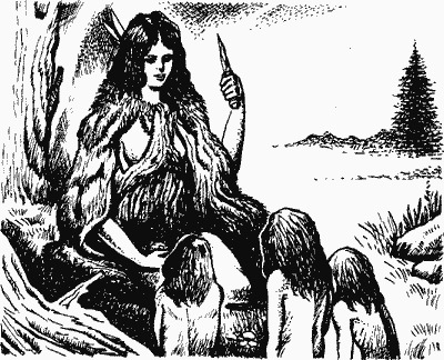 Лото вышла из шалаша с задней стороны и неожиданно появилась пред огнем. Она снова надела ту же странную шапку с меховой полоской спереди. Но теперь она должна была изображать уже не прародительницу Дантру, тетку Мамонта, а самого высокого гостя.