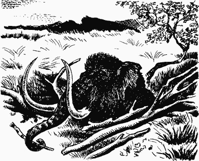 Около костра, на видном месте, устроили "гостей". Это были воскресающие звери. Главное место занимал Мамонт Сса. Он был представлен куском собственной шкуры, на которой лежали оба глаза, щепотка шерсти с подгрудка, частицы сердца и печени, крошки мозга, кусочки жира от почек. Мертвые глаза были круглые, матовые, с жилками пожелтевшей крови. Их повернули к огню зрачками, и дымное пламя слабо отразилось в их тусклом овале.